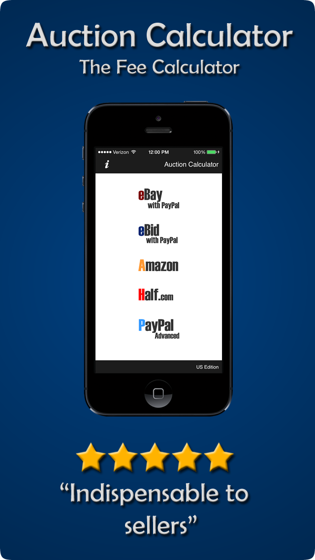 Auction Calculator - Professional Edition is a comprehensive and user-friendly set of fee calculators and “reverse” calculators for 5 top auction sites: Amazon, eBay, eBid, Half.com and PayPal. We created this app to help you save time and money. The fee calculators provide you with all the tools you need to calculate fees for all combination of listing upgrades, categories and auction types, while the reverse calculators let you know the minimum price at which you need to sell your item in order to make your desired profit.